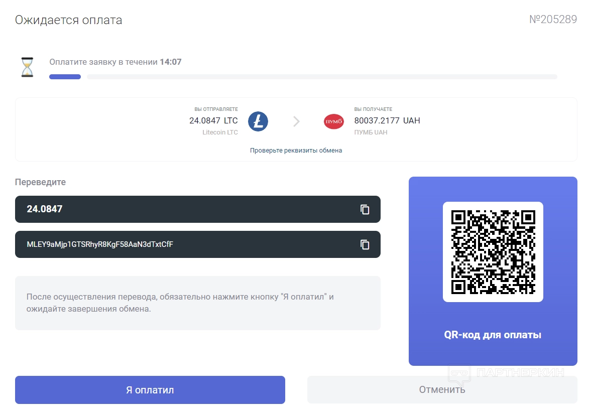 Оплатить заявку необходимо в течение 15 минут. После осуществления перевода нажмите кнопку «Я оплатил» и ожидайте завершения обмена. Перевести средства можно двумя способами: по номеру кошелька или QR-коду.