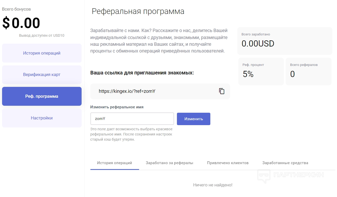 Kingexможет заработать на привлечении друзей и знакомых. Для клиентов также доступен кешбэк. Владельцы ресурса создали хорошую бонусную систему, которая мотивирует пользоваться обменником.