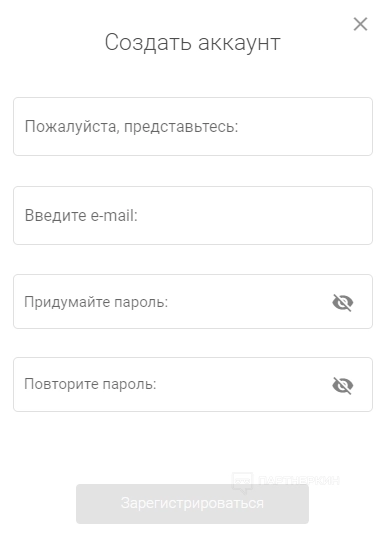 Для создания аккаунта нажмите кнопку «Регистрация» в правом верхнем углу. Откроется форма: укажите в ней имя, адрес электронной почты и пароль.