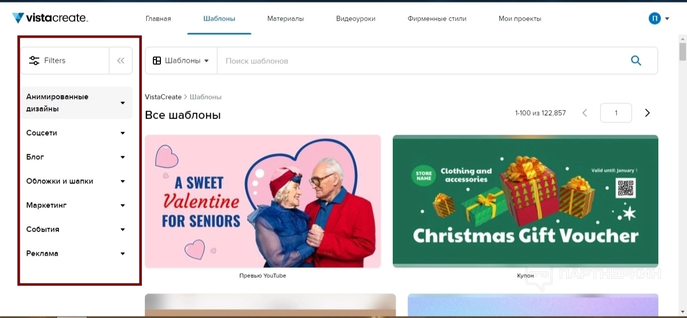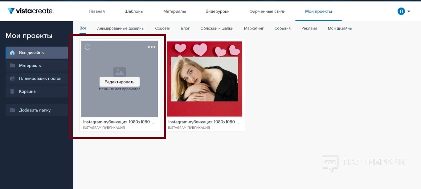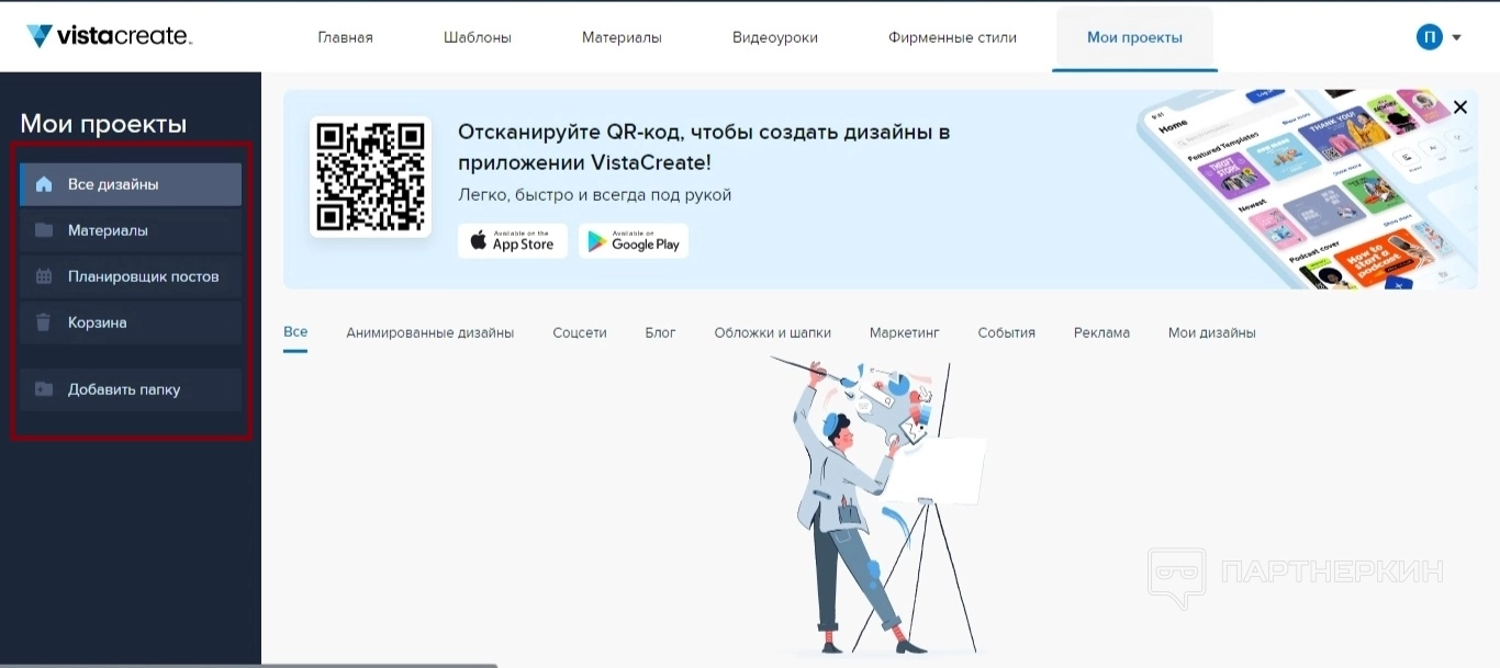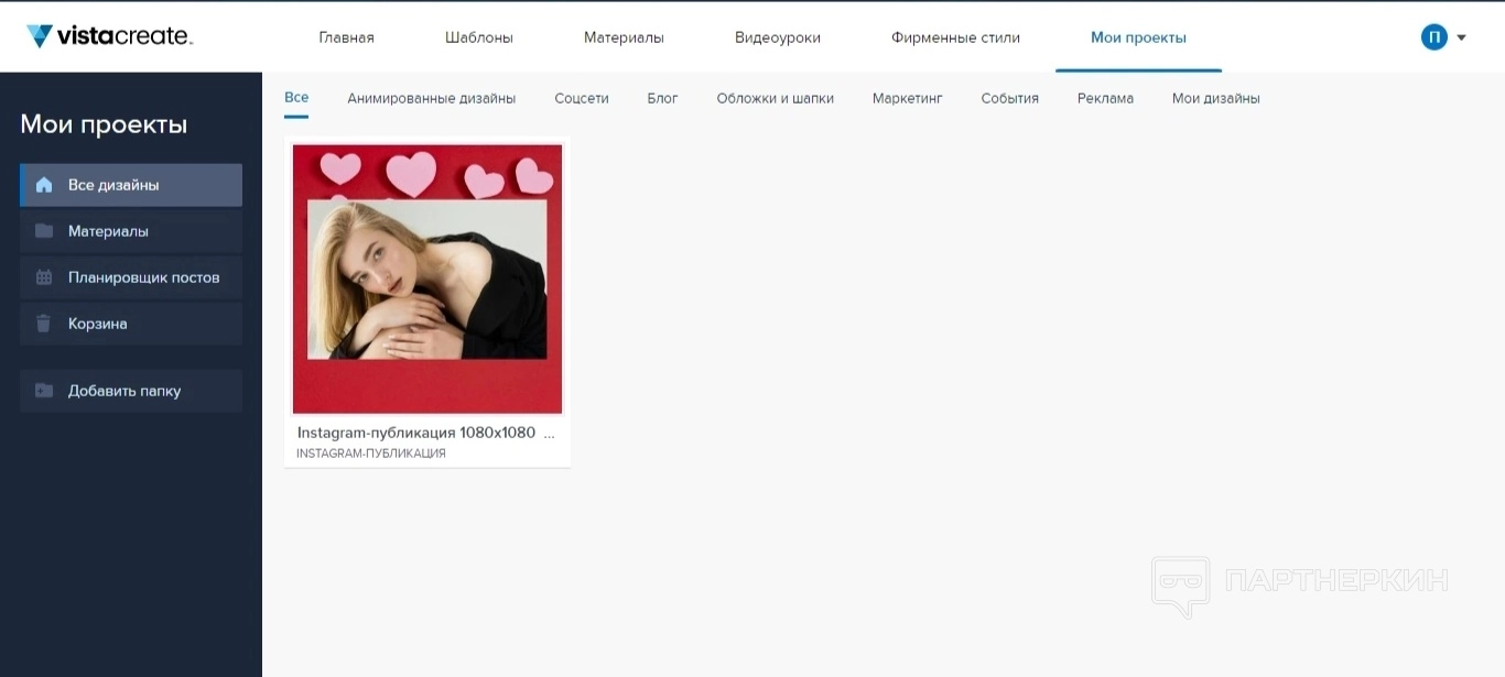 - все дизайны — можно просмотреть все созданные дизайны, начиная от анимированных и заканчивая рекламными;