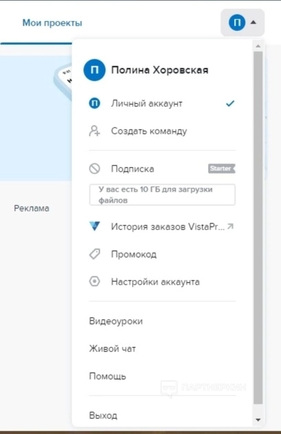 Нажимая на значок своего профиля, пользователю открывается небольшое дополнительное меню.