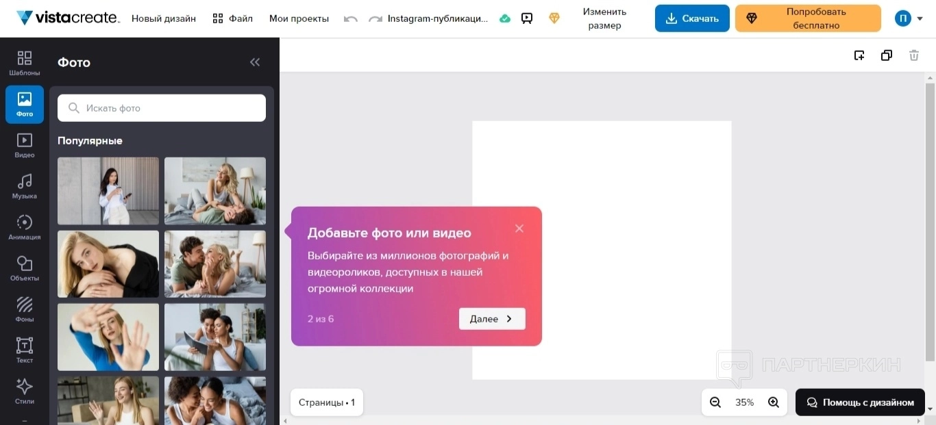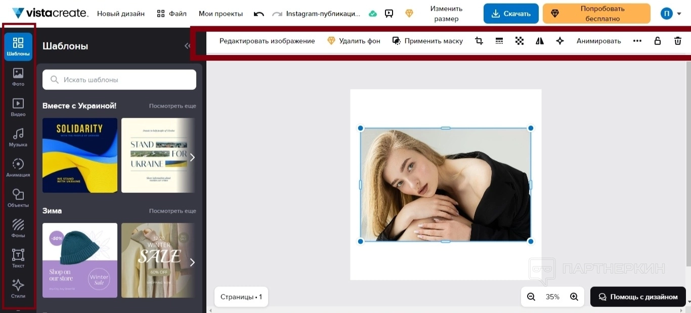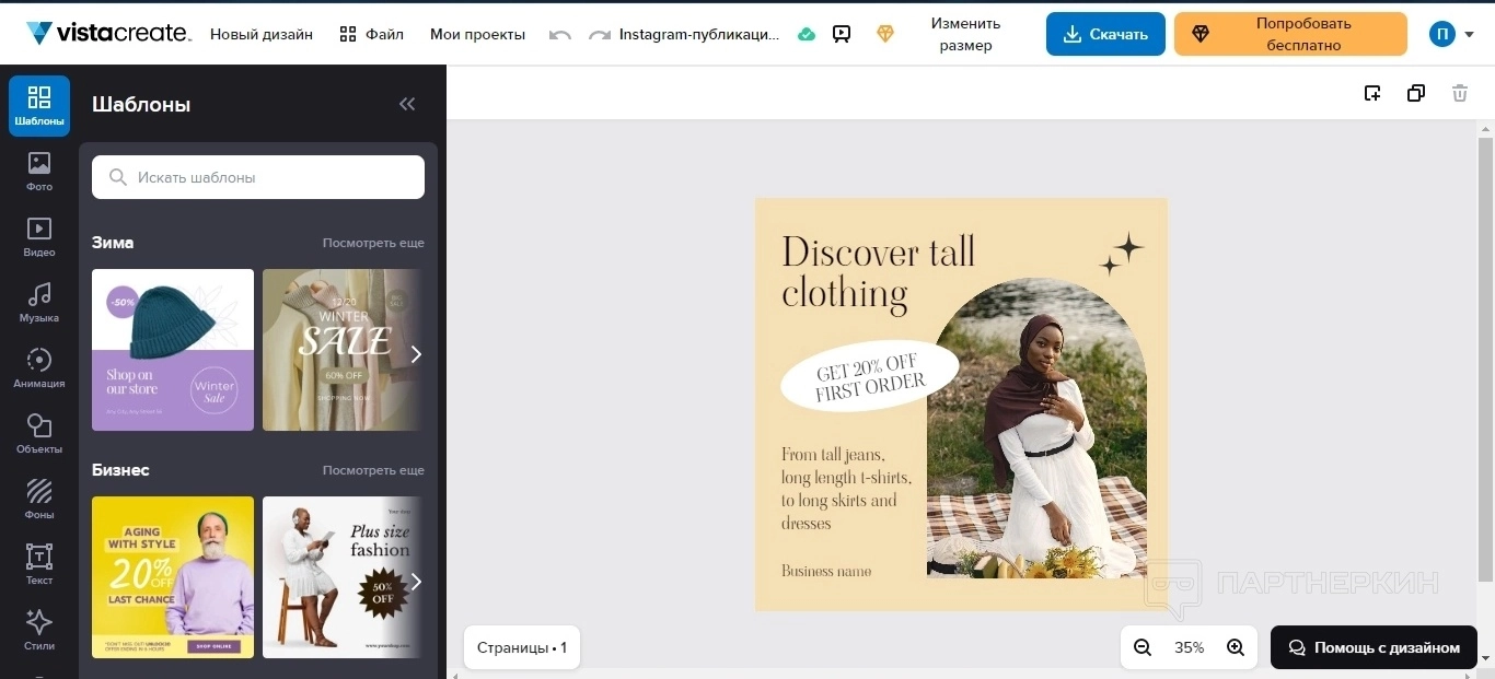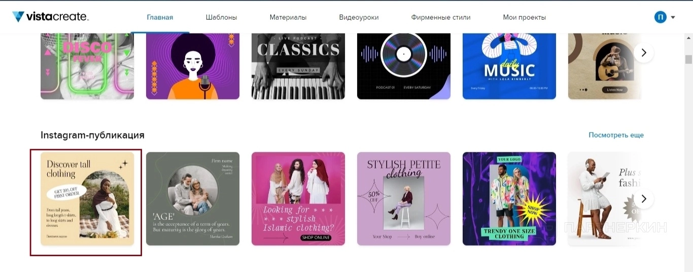 Для тестирования сервиса в создании креативов с нуля был выбран шаблон для Instagram*-публикации.