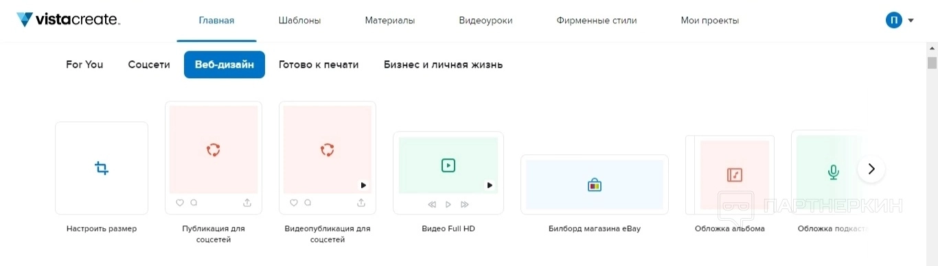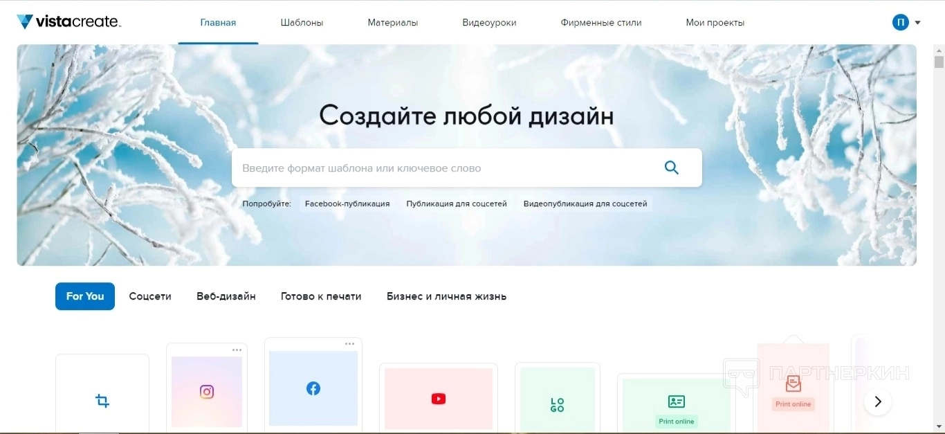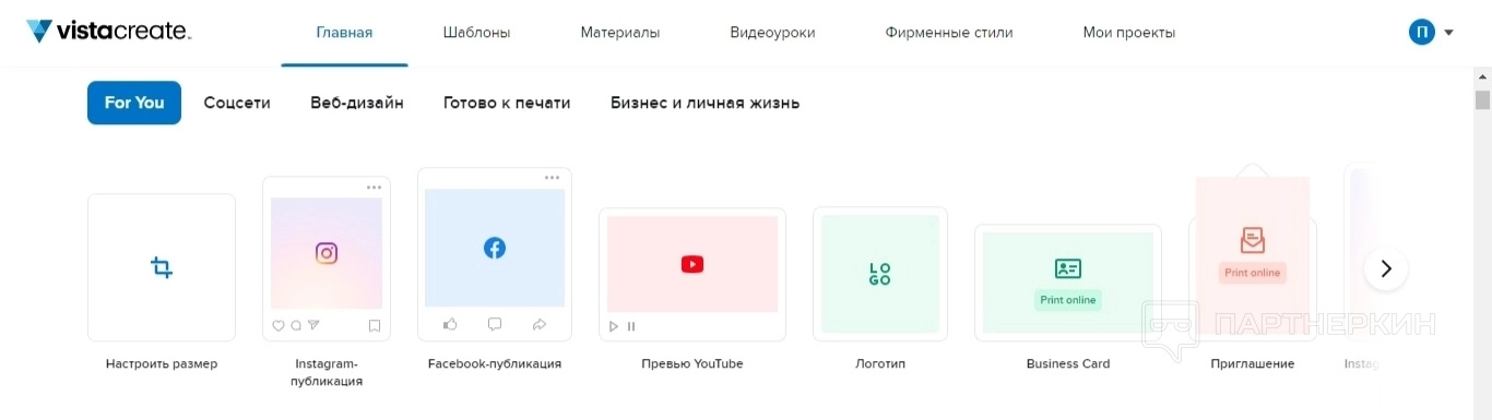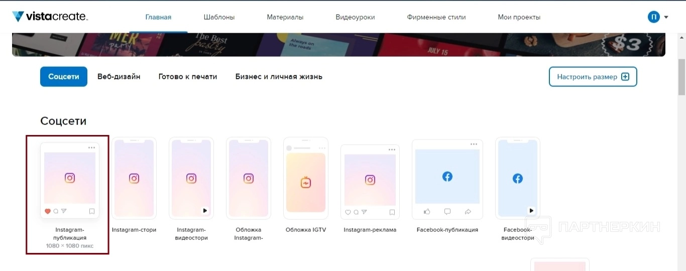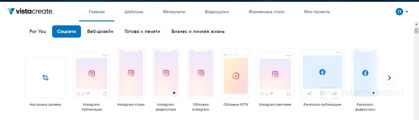 Категория Соцсети отвечает за шаблоны разных форматов и размеров исключительно для социальных сетей. Среди них встречаются Instagram*, Facebook*, YouTube, Pinterest, Twitter и многие другие. Можно создать креатив в виде превью для видеороликов, историю, посты в ленту и так далее.