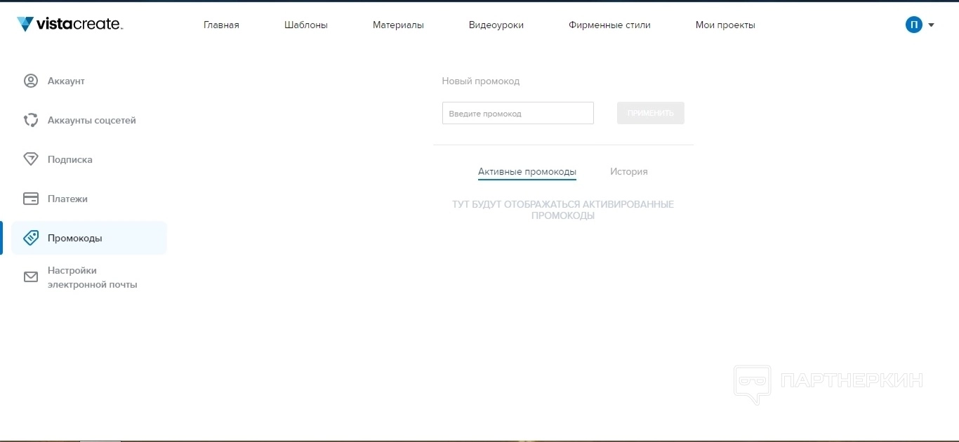 Раздел Промокоды предназначен для информирования пользователей о наличии у них промокодов. Их можно вводить и применять к нынешнему плану подписки. Здесь же хранится и история об уже использованных кодах.