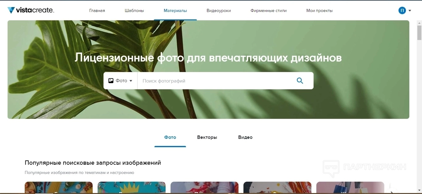 Раздел Материалы отвечает за предоставление лицензионных фотографий, видеороликов или векторов для создания на их основе своих креативов. Фактически, здесь находятся качественные материалы от профессиональных фотографов и так далее.
