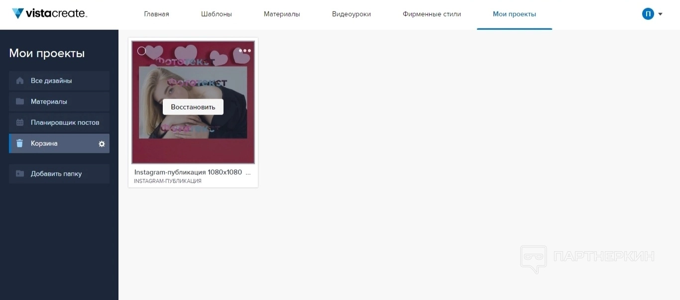 - корзина — здесь хранятся креативы, которые были удалены самим владельцем. Автоматической очистки нет, все делается вручную, поэтому даже материалы из корзины доступны для восстановления или до момента полной очистки;