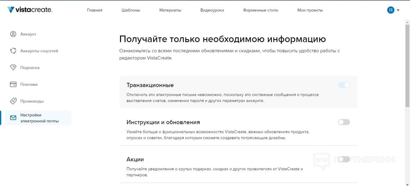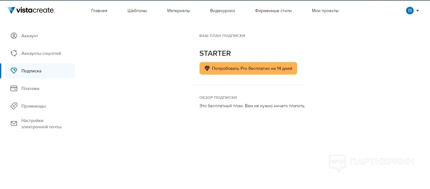 Раздел Подписка практически дублирует информацию о статусе кабинета. После регистрации у всех пользователей автоматически установлен план подписки Starter — бесплатный режим использования сервиса, но с некоторыми ограничениями в возможностях создания креативов. По времени данный режим не ограничен, только если пользователь не захочет приобрести премиум.