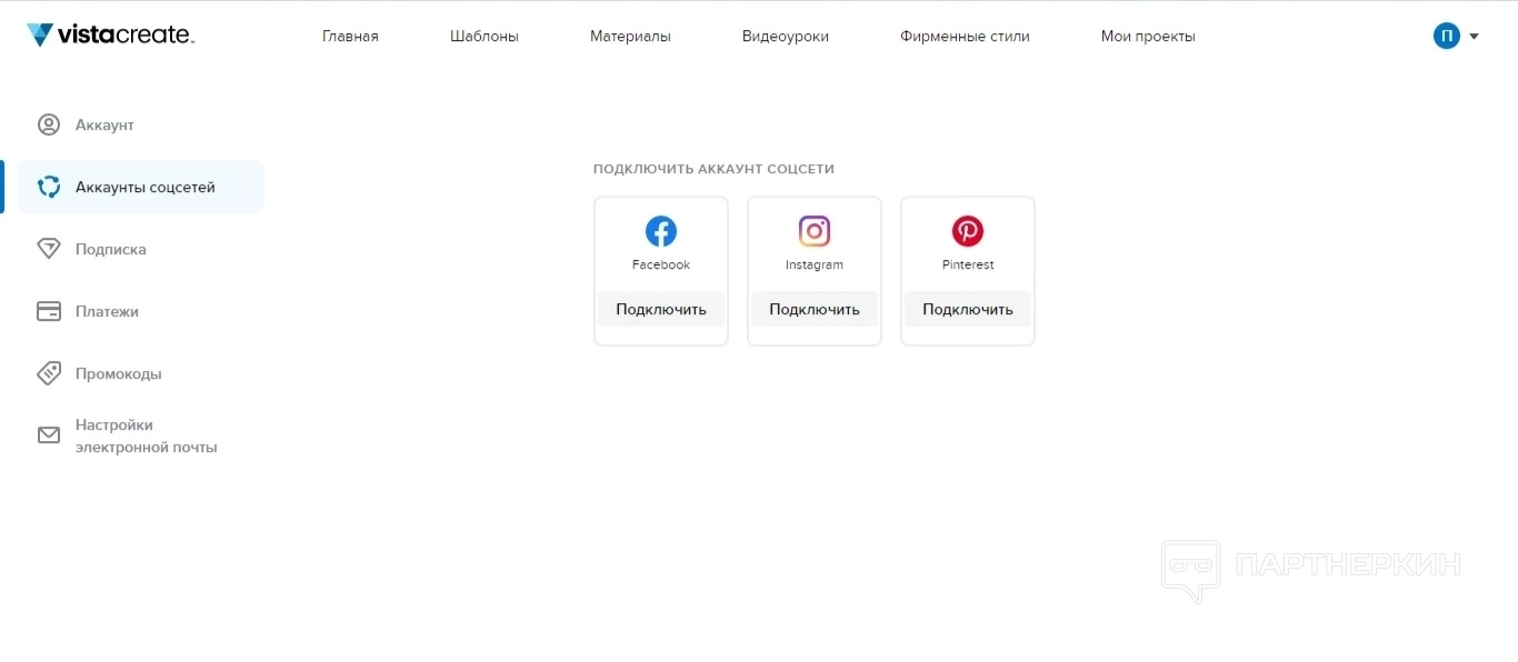 В разделе Аккаунты соцсетей можно подключить свои профили в Facebook*, Instagram* и Pinterest.