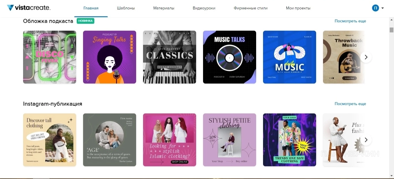 Если пролистнуть главную страницу сервиса вниз, то подавляющую часть пространства будут занимать готовые креативы от других пользователей и самого сервиса. Их можно использовать в качестве вдохновения или же в качестве основы для своего проекта. Можно сделать как то же самое, но в своей интерпретации, так и изменить какие-либо детали на свое усмотрение.