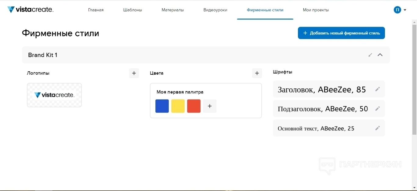 Раздел Фирменные стили отвечает за создание своего персонального креатива. Здесь можно добавить свой персональный логотип, цветовую гамму и даже шрифты. Стилей может быть несколько, каждый создается отдельной строкой.