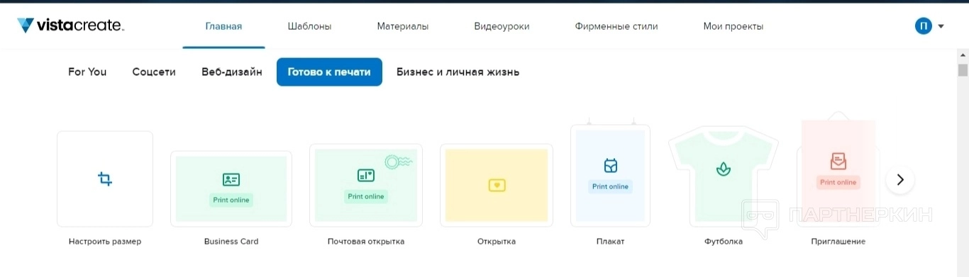 Категория Готово к печати отвечает за шаблоны креативов, предназначенных для распечатки. Здесь можно создавать свою персональную визитку, подарочные сертификаты, билеты, открытки, плакаты, приглашения на мероприятие и многое другое.