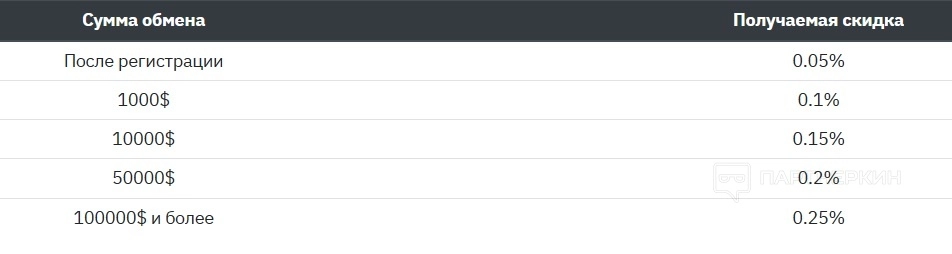 Клиенты, которые пользуются обменником постоянно и долгое время, могут сэкономить на комиссии с помощью накопительной системы скидок. После регистрации в сервисе клиент получает скидку 0,05%. Если клиент обменивает: