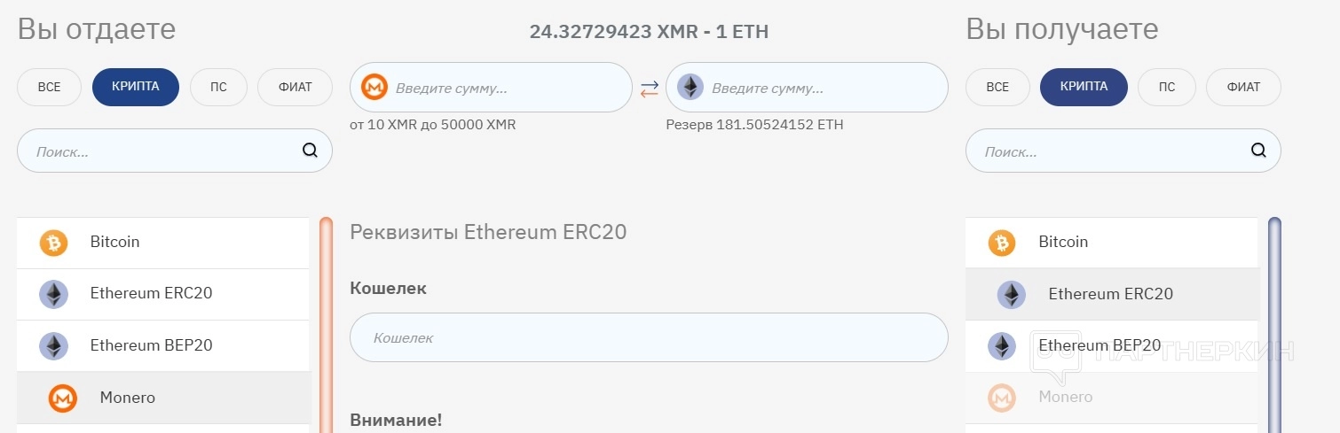 Чтобы обменять или купить криптовалюту, нужно перейти в раздел с обменом на главной странице, указать валюту, которую требуется обменять, выбрать платежное средство. Также нужно указать свой криптокошелек.