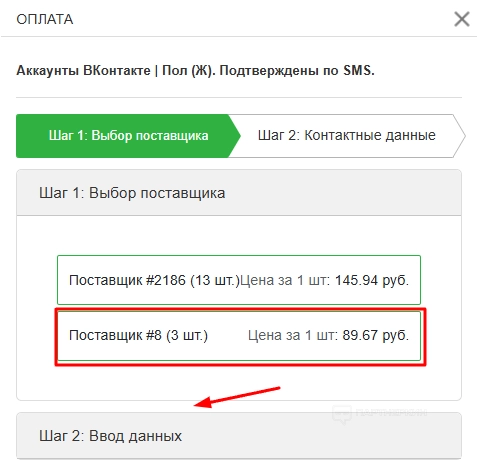 Выберите поставщика. В нашем примере их два. Отдадим предпочтение более дешевому варианту и перейдем к следующему шагу.