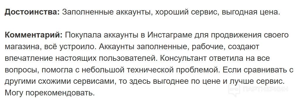 Еще одна девушка покупала аккаунты для продвижения своего магазина. Все аккаунты были заполненные и рабочие, создавали впечатление реальных пользователей. Техподдержка на месте: помогает быстро решить возникающие вопросы.