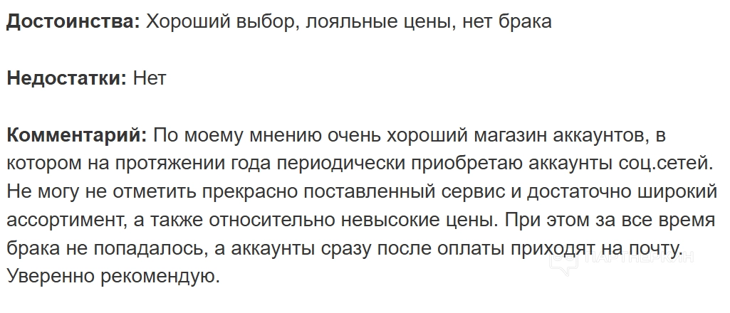 — один из самых популярных сайтов для покупки и продажи аккаунтов. Пользователь отмечает, что на протяжении года он приобретает профили социальных сетей. Широкий ассортимент, невысокие цены, оперативность и отсутствие брака — главные преимущества площадки.
