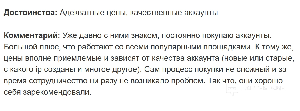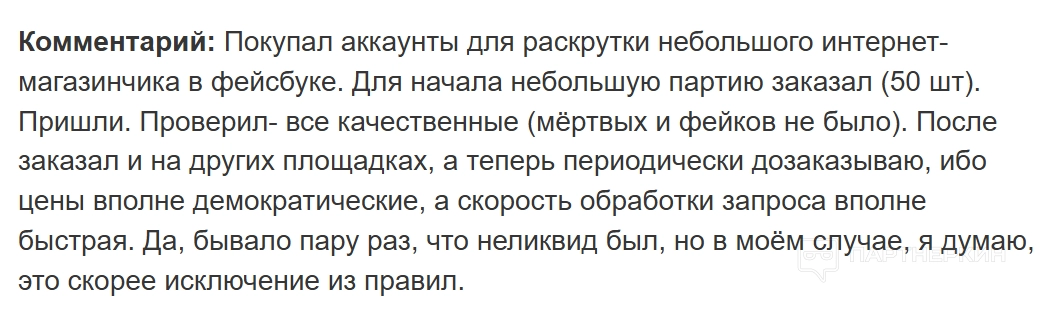 Другой юзер покупал аккаунты для раскрутки небольшого интернет-магазина в Facebook*. Пользователь приобрел 50 учеток — все оказались качественными. Клиента устраивают демократические цены и высокая скорость обработки запроса.