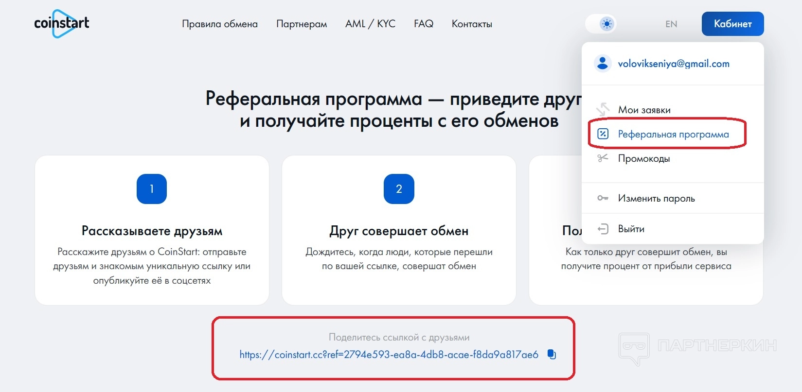Участие в реферальной программе становится доступным после регистрации. Нужно перейти в раздел "Реферальная программа" в личном кабинете и взять реферальную ссылку. Эту ссылку можно отправлять друзьям, публиковать в своих соцсетях. Если по ссылке люди совершат обмен валюты, то пользователь-владелец ссылки получит партнерское вознаграждение — процент от прибыли сервиса. Размер вознаграждения зависит от количества приглашенных клиентов: