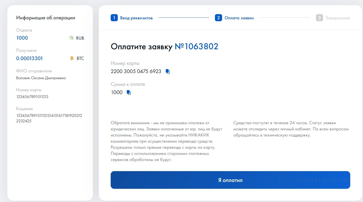 - При отправке денежных средств в криптовалютах Bitcoin, Litecoin, Ethereum заявка на обмен будет выполнена после двух подтверждений транзакций.