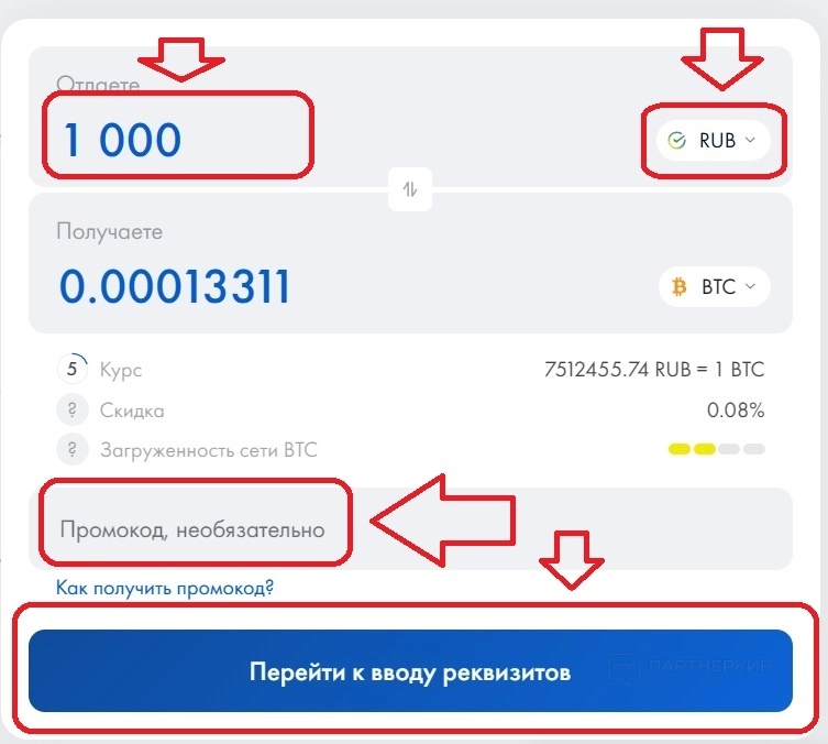 Для формирования заявки нужно перейти на главную страницу и в поле для обмена справа ввести: сумму обмена, валюту, при необходимости промокод, и нажать на "Перейти к вводу реквизитов".