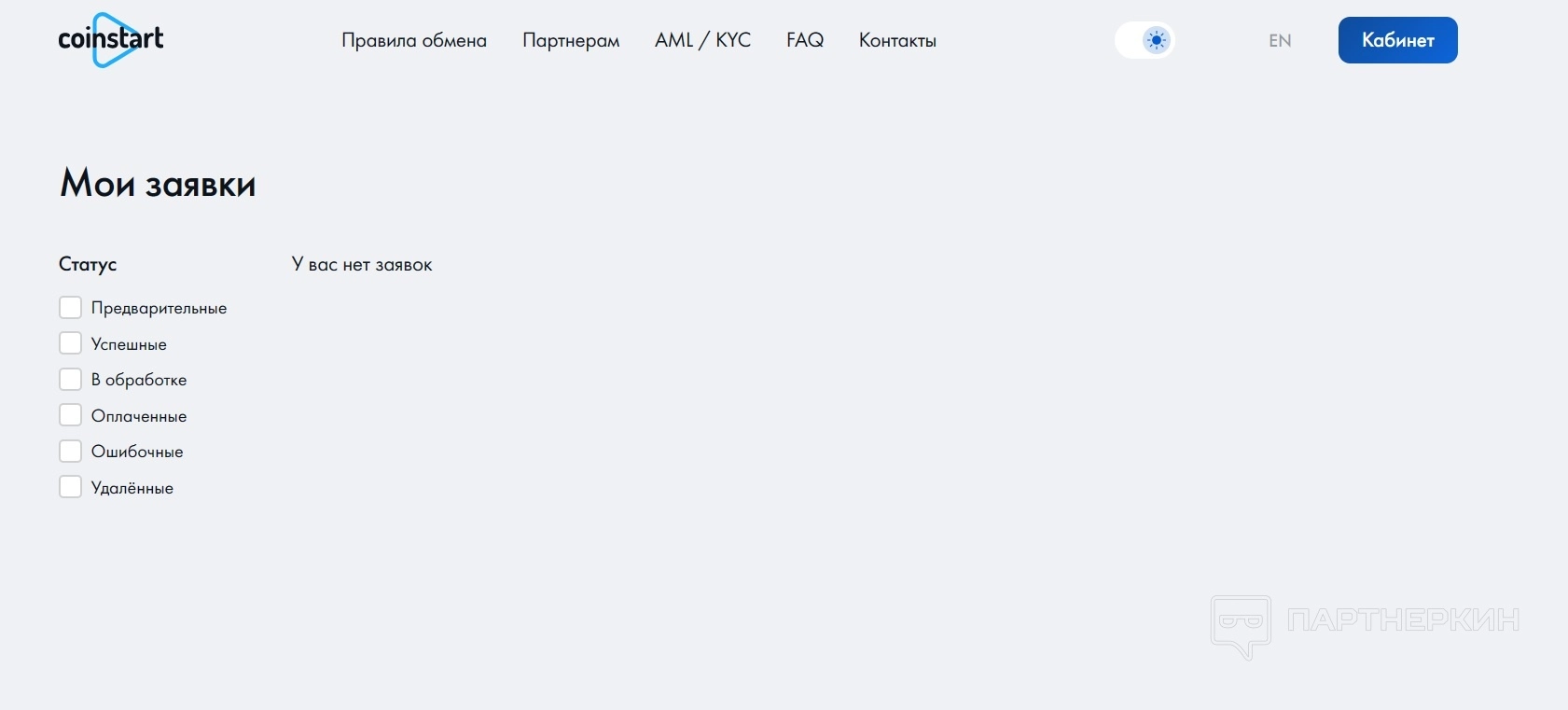 Чтобы совершить обмен, вам потребуется заполнить заявку, указав курс, метод обмена и сумму перевода. Статус вашей заявки всегда можно отследить в Личном кабинете, доступ к которому вы получите по электронной почте после регистрации или при первой отправке заявки.