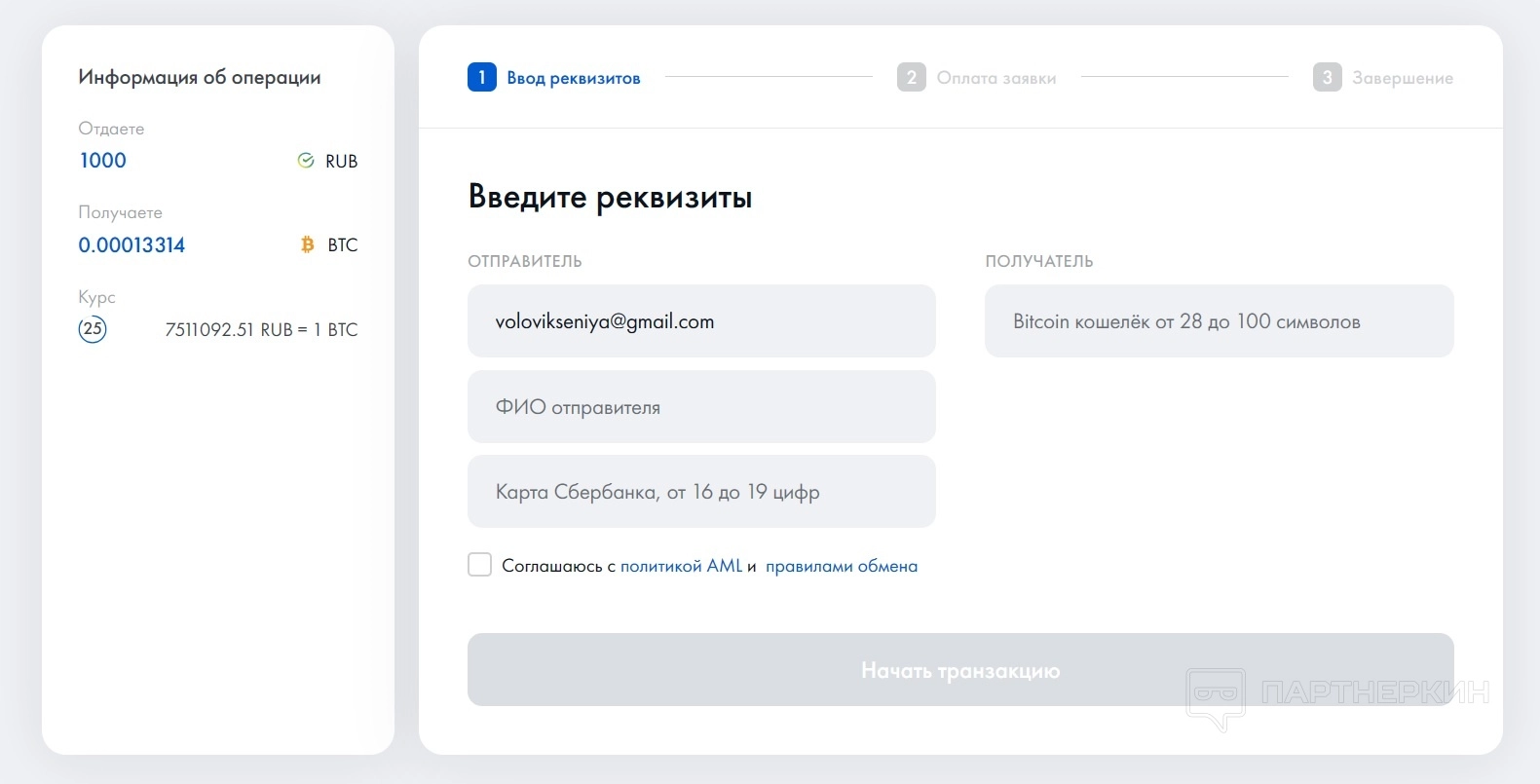 Понадобится ввести почту отправителя, ФИО, номер карты банка, номер карты или реквизитов получателя (например, его биткоин-кошелек), поставить галочку о согласии с требованиями KYC и AML. Затем нужно нажать на "Начать транзакцию".