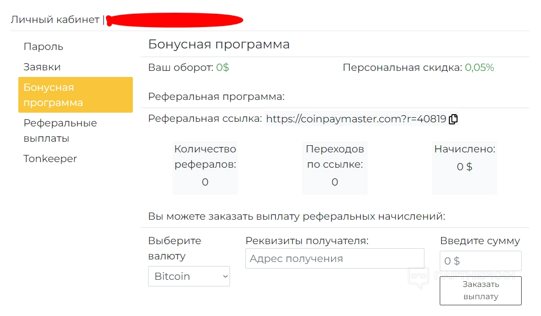 В личном кабинете можно изменить пароль, посмотреть свои заявки, проанализировать статистику по бонусной программе и реферальным выплатам, добавить Tonkeeper.