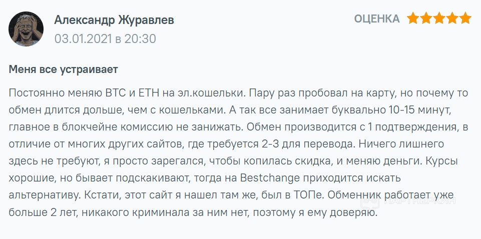 По отзывам клиентов, обменник производит хорошее впечатление. Комиссии у сервиса приемлемые, по многим популярным направлениям выгодно менять криптовалюту. В плюс играет высокая оценка площадки на BestChange. Многие пользователи при выборе обменника ориентируются на этот ресурс.