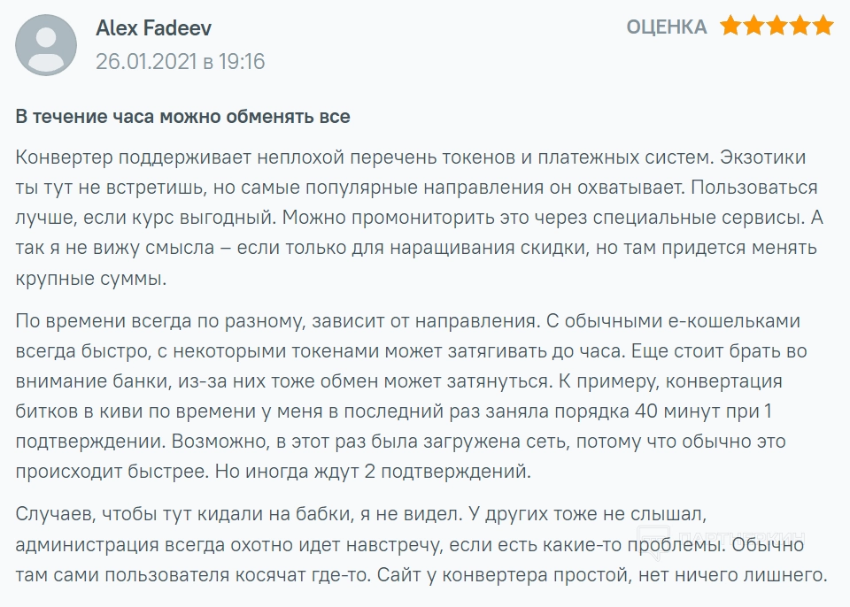 Пользователи отмечают хороший перечень токенов и платежных систем. Клиентам нравится быстрая скорость обмена. Если возникнут трудности, то специалисты технической поддержки ответят на все вопросы.