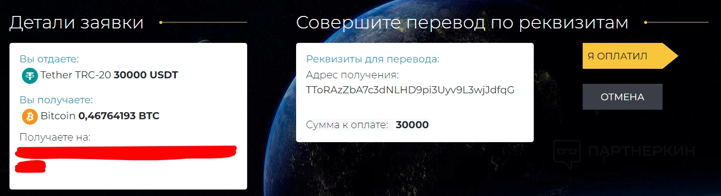 - Валюта, которую отдает пользователь (например, Tether TRC-20). Указать реквизиты отправителя.