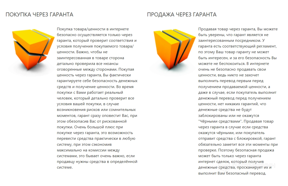 - Безопасность. Все операции проходят с участием гаранта, который проверяет данные, деньги и товар, исключая риски мошенничества.