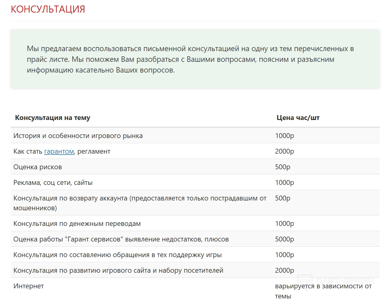 Сервис также предоставляет письменные консультации по различным темам. Это может быть помощь в оценке рисков, составление обращений, консультации по работе с игровыми рынками и другие услуги. Стоимость варьируется от 500 до 2000 рублей в зависимости от темы. Например: