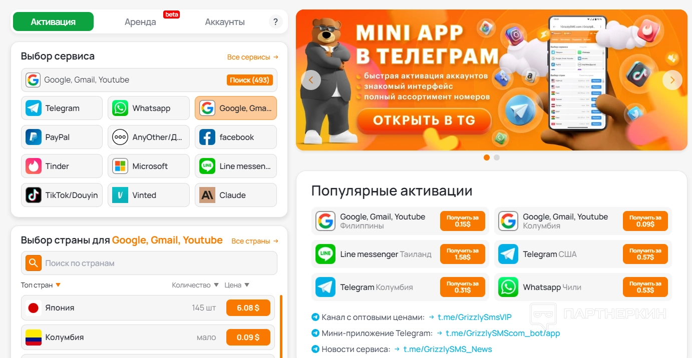 работает просто и понятно, будто создан для тех, кто ценит время. Суть в том, что вы можете арендовать виртуальный номер для получения SMS. Заходите на сайт, выбираете нужную платформу, будь то соцсеть, мессенджер или какой-нибудь сервис. Далее сервис выдает вам номер, который используется для активации аккаунта. Все — SMS с кодом приходит прямо в интерфейс Grizzly SMS, и вы его видите в реальном времени.