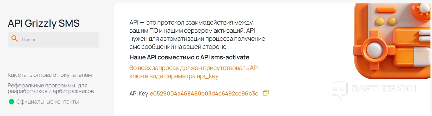 1. API. Этот раздел предназначен для арбитражников и тех, кто хочет стать оптовым покупателем. Здесь можно найти всю информацию о массовых покупках номеров, получить доступ к API-ключам для автоматизации процессов и уточнить ответы на часто задаваемые вопросы.