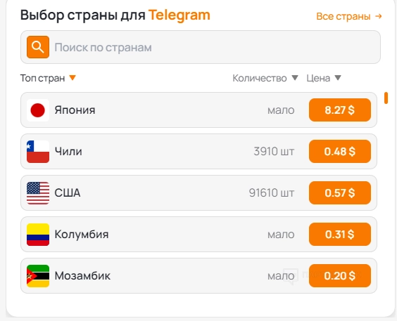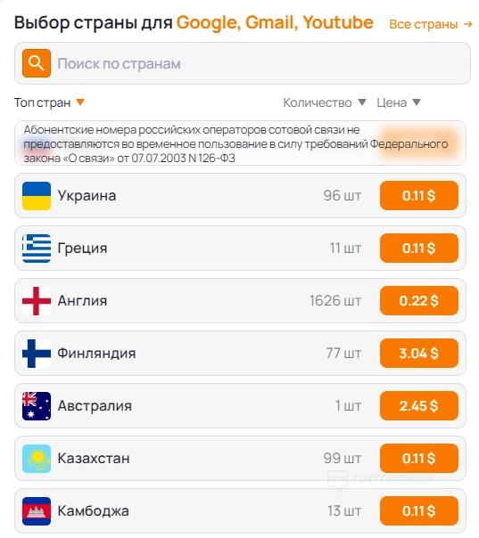 Когда выберете сервис, во второй форме отобразится список доступных вариантов по странам. Напротив ГЕО вы увидите доступное количество и стоимость за одну штуку.