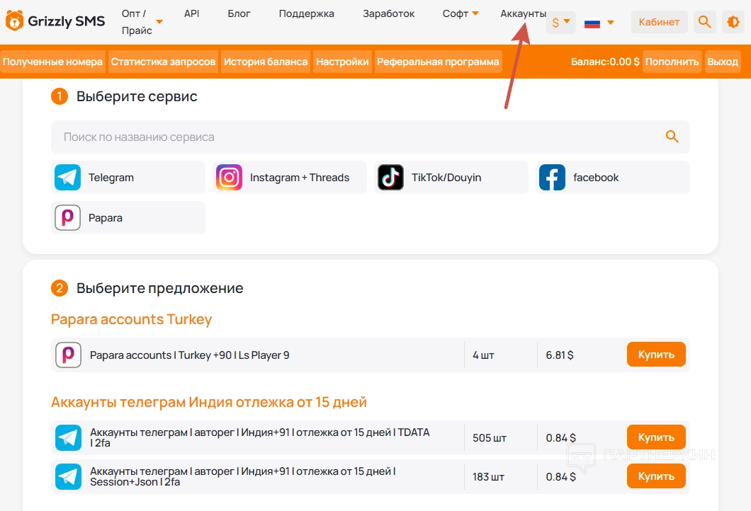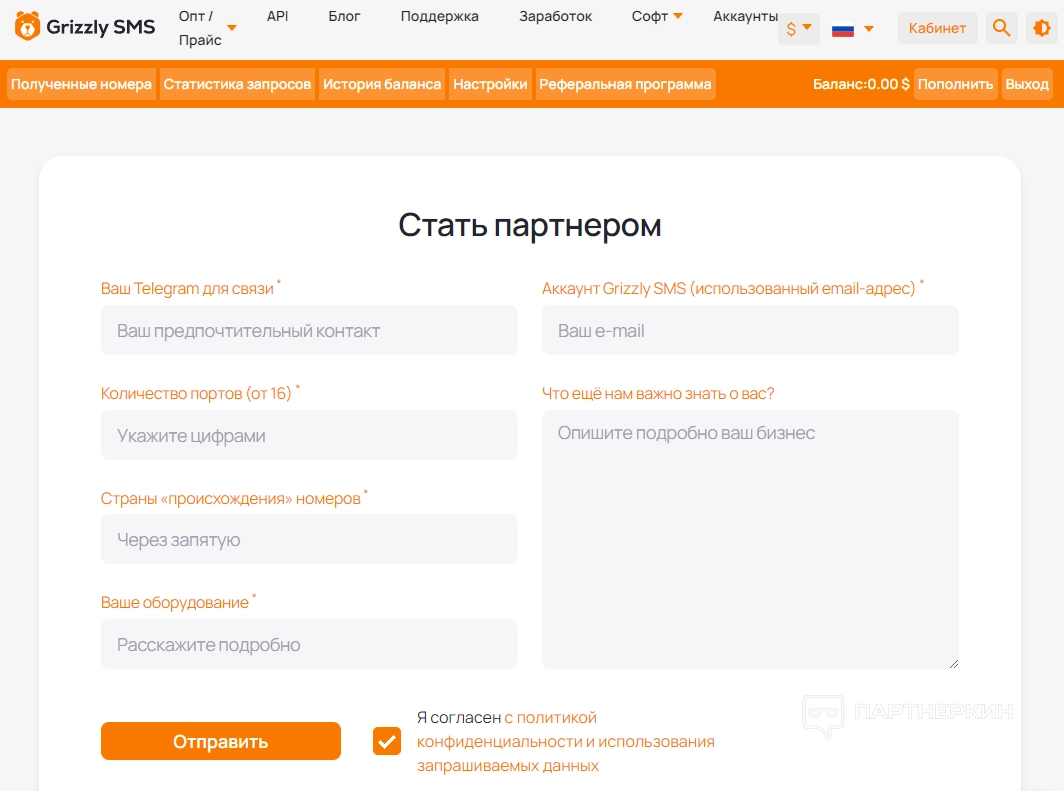 3. Заработок . Раздел для партнеров, которые хотят работать поставщиками активаций и телефонных номеров. Есть приветственные 5 000 рублей на партнерский баланс. Выводить можно суммы от $100.