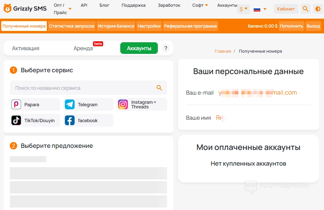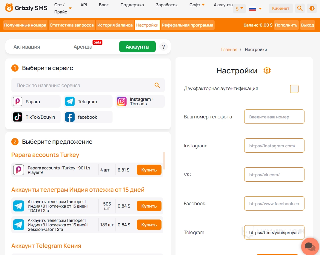 Если заморачиваться с регистрацией не хочется, можно сразу взять готовый аккаунт. Grizzly предлагает аккаунты популярных соцсетей — уже активированные и готовые к использованию. Удобно, если надо быстро приступить к работе или тестированию.