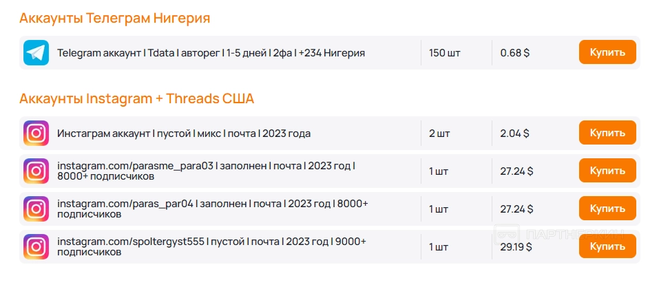 К сожалению, карточек под каждый товар нет, но это не страшно. Необходимую информацию вы увидите в  описании продаваемого аккаунта. Зачастую продавец указывает тип аккаунта (саморег или авторег), регион, длительность отлежки, дату создания и количество подписчиков. Также отображается количество доступных аккаунтов и их стоимость (цена за одну штуку).