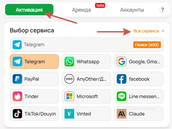 Приобрести номер телефона можно в разделе «Активация». Сначала вам нужно выбрать сервис, для которого вы намерены приобрести виртуальный номер для активации. Всего Grizzly SMS поддерживает 493 сервиса. Чтобы развернуть весь список, достаточно нажать на соответствующую кнопку.