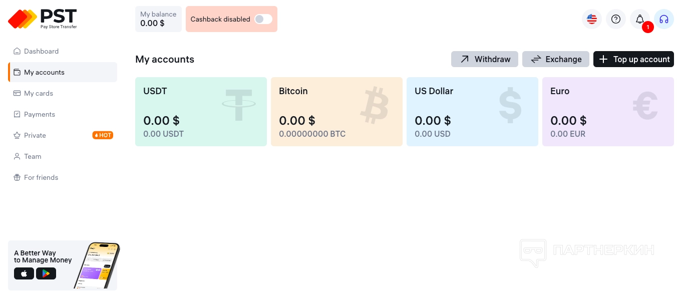 На главной странице доступна информация по счетам внутри сервиса. Счета доступны в четырех валютах: