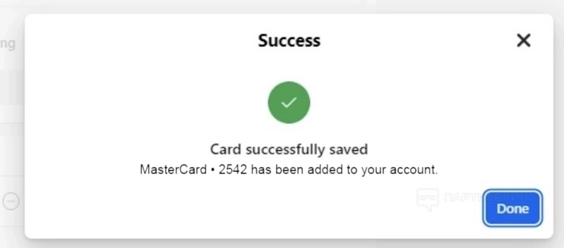 Для проверки возьмем карту 559666****2542 и привяжем к Facebook*: Получаем успешный результат:
