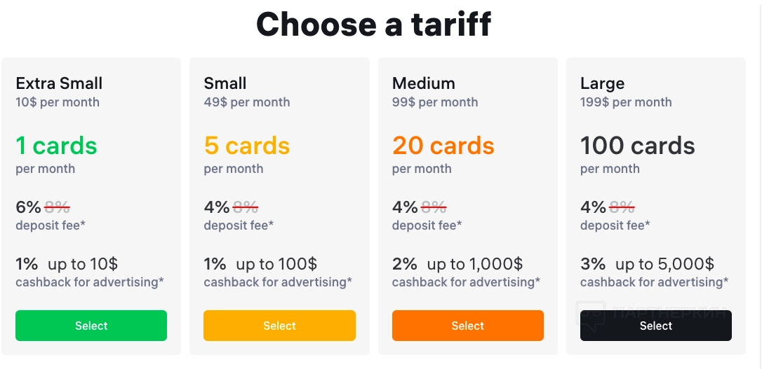 Участие в программе оплачивается по-тарифно. Доступно 4 тарифа: Extra Small, Small, Medium, Large.