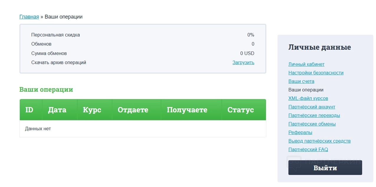 В разделе «Ваши операции» можно найти подробную статистику по суммам обмена, курсу, ID, другим параметрам, а также скачать архив операций.