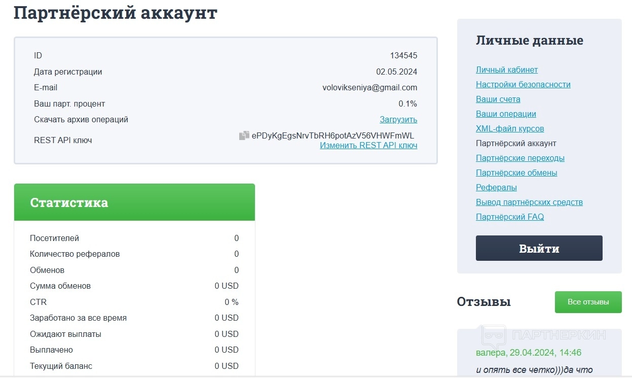 В разделе «Партнерский аккаунт» и других разделах, касающихся участия в партнерке i-obmen.bz, можно смотреть статистику по своим привлеченным рефералам, воспользоваться API-ключом. Также там есть партнерские материалы — ссылки«, вставки в код.