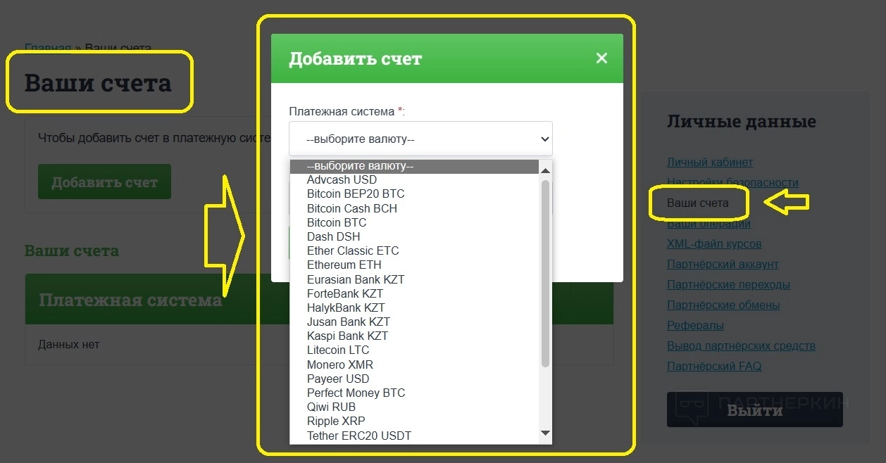 Кошельки для совершения обмена добавляются через раздел «Ваши счета».