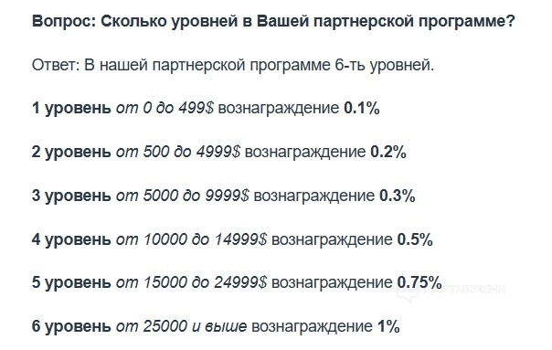 - 5 уровень: от $15 000 до $24 999 — вознаграждение 0,75%
