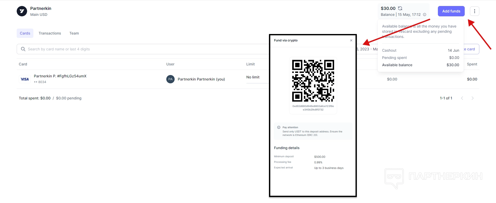 общий баланс для всех карт, поэтому отдельно пополнять ничего не нужно. Есть кнопка обновления и статистика холда. К аккаунту привязан криптокошелек, который легко пополнять по QR–коду.