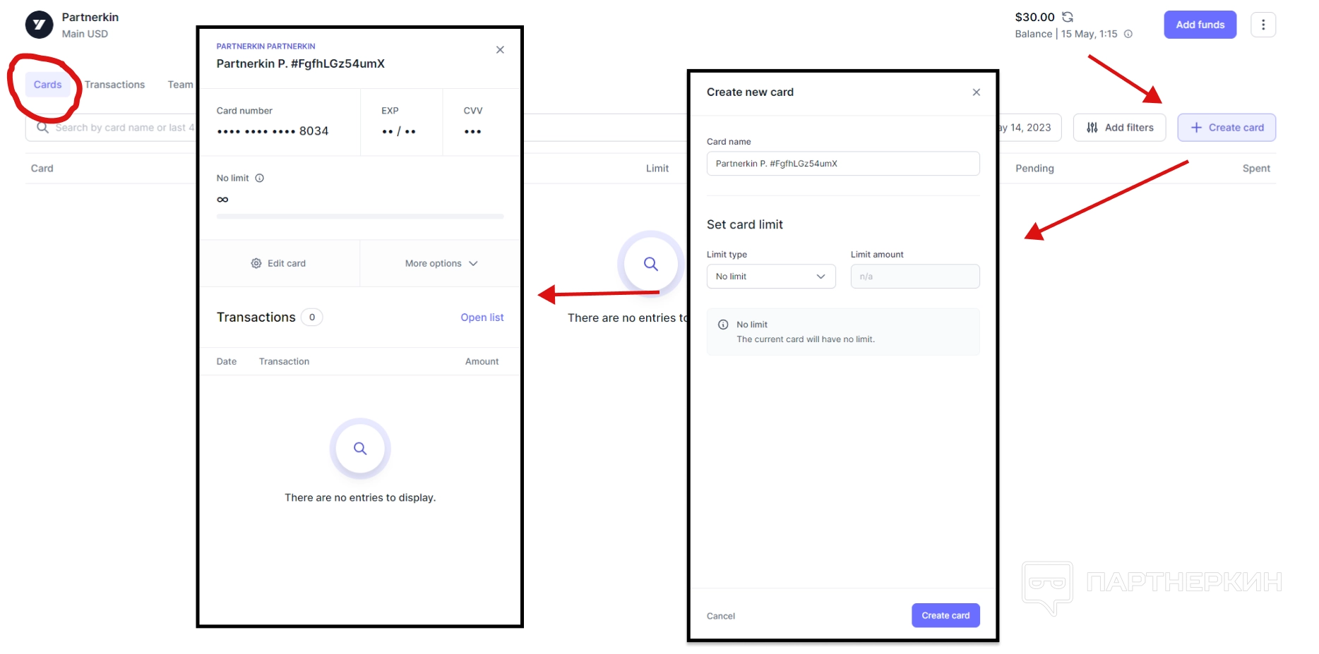 • Карты и их выпуск. Заходим в раздел карт и нажимаем «Create card». Можно выбрать имя держателя или не трогать поле, и оно генерируется автоматически. Есть возможность установить лимиты как по временному промежутку, так и по сумме транзакции. Данные карты копируются по клику, что значительно упрощает их добавление в рекламные кабинеты.