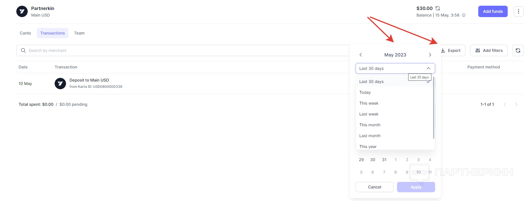 • Раздел транзакций. Здесь отображаются пополнения так и траты. Видно, откуда и куда ушли деньги. На всех вкладках интерфейса есть кнопка «Add Filter». Благодаря ей можно выбирать только интересующие вас данные. Их можно выгрузить в CSV через кнопку «‎Export»‎ для дальнейшего подробного анализа. Данные будут отправлены на почту.