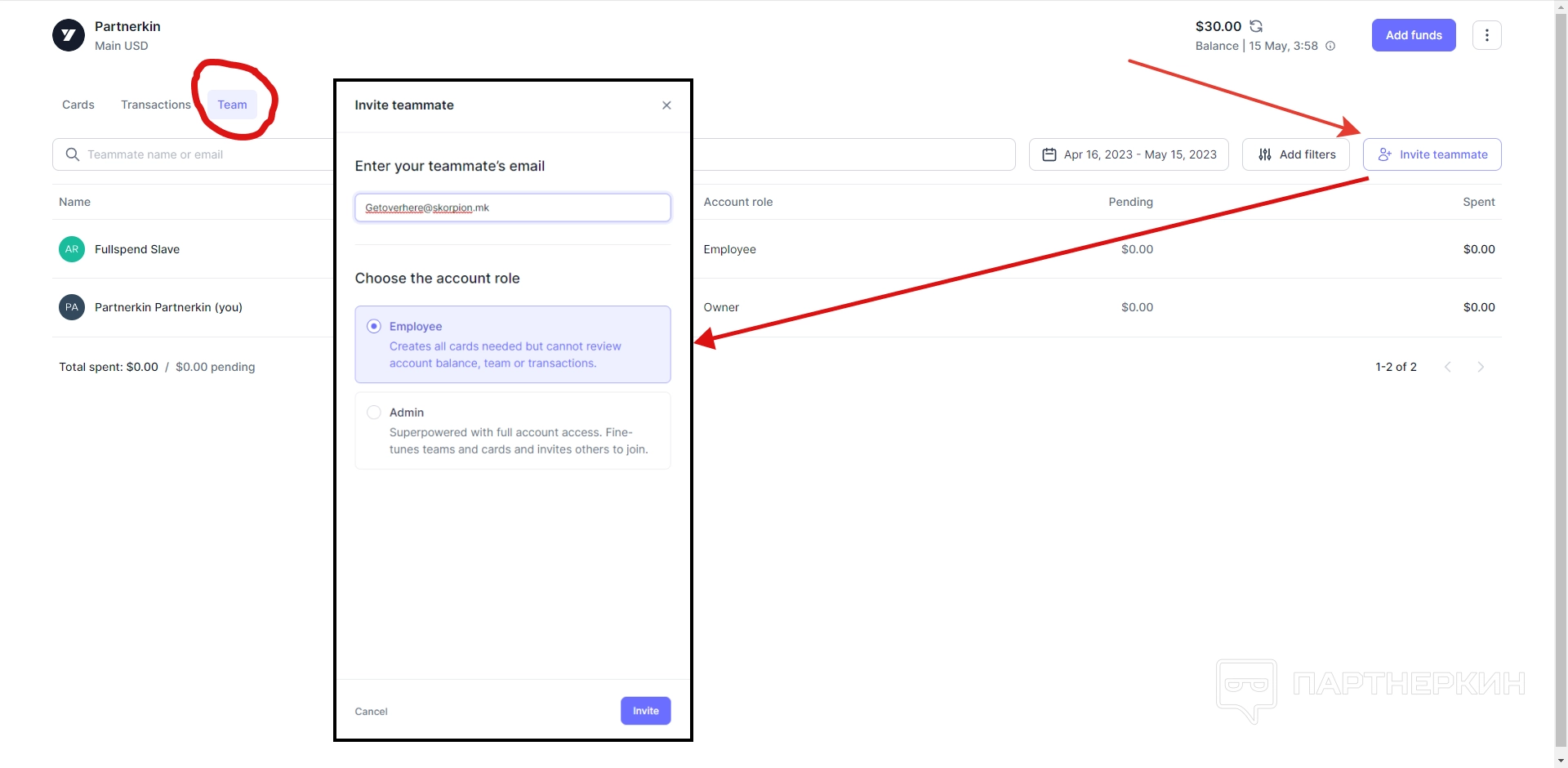 Owner является админом. Эта роль достанется тому, кто будет проходить онбординг и аккаунт будет привязан к его почте. Owner имеет полный доступ к сервису. Admin — еще одна роль с полным доступом к функционалу. Можно выпускать и настраивать карты, просматривать транзакции и баланс, приглашать новых пользователей и выдавать роли. Employee — роль сотрудника. Он может выпускать неограниченное количество карт и настраивать свои карты. Он не может смотреть чужие карты и транзакции, не видит других сотрудников, не видит общий баланс и пополнения или переводы по аккаунту.